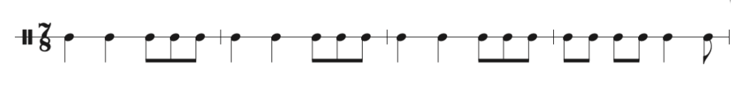 En el tema Zumbul del grup de punk-gypsy de Seattle Kultur Shock podem escoltar clarament (sobretot a l’inici del tema, però realment el patró és gairebé constant al llarg de tota la peça) un compàs de 7/8 repartit en (2+2+3)/8, majoritàriament seguint el patró rítmic següent: