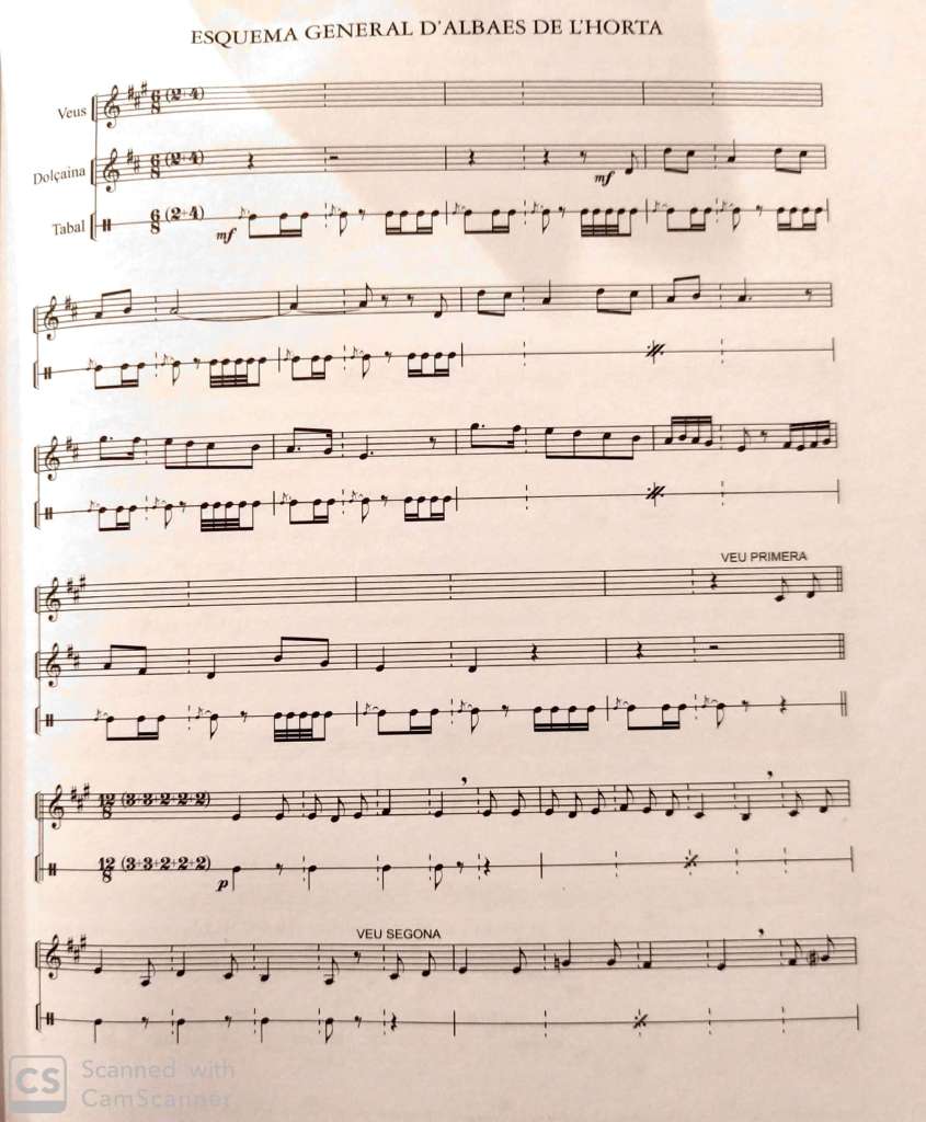 En les albades de l’Horta», anomenades així perquè és en aquesta comarca on estan més popularitzades, el dúo dolçaina i tabal, més que acompanyar, separa amb intervencions instrumentals les estrofes cantades pràcticament a cappella per la persona que canta, que fa ostentació les seves qualitats vocals i de la seva capacitat d’improvisació basant-se en una melodia-tipus que sempre és la mateixa i està en una tonalitat inamovible, La major, circumstància com el cant d’estil, exigeix una tessitura vocal molt aguda, sobretot per a les veus masculines.