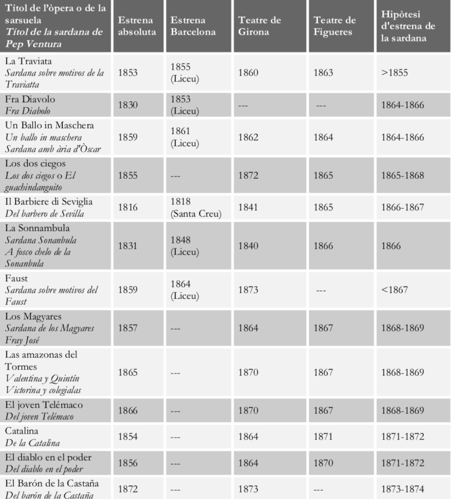 El primer element a destacar d’aquest quadre és el fet que Pep Ventura no utilitza exclusivament melodies d’òpera italiana per a les seves sardanes basades en obra lírica, si no que també se serveix d’obres d’autoria espanyola com El joven Telémaco o Los Magyares. No obstant, les òperes italianes belcantistes conformen el corpus més nombrós dins d’aquesta tipologia de sardana. Com ja s’ha apuntat més amunt, les òperes que s’estrenaven a Barcelona arribaven al cap de poc temps a Girona i Figueres (en algun cas extrem van passar 50 anys), però el que és més rellevant és el poc interval temporal existent entre l’estrena al Teatre de Figueres (on Pep Ventura hi tocava el clarinet) i l’estrena –hipotètica- de la sardana, normalment un o dos anys més tard.