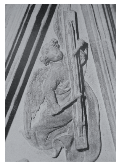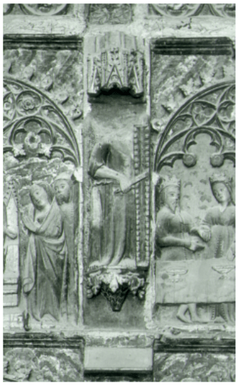 Imatge 3 Representació d’un àngel tocant aquest tipus de tambor (primer quart del segle XV). Peça de terracota anònima localitzada a la capella del Palau Dalmases de Barcelona. (Autor: Jordi Ballester).