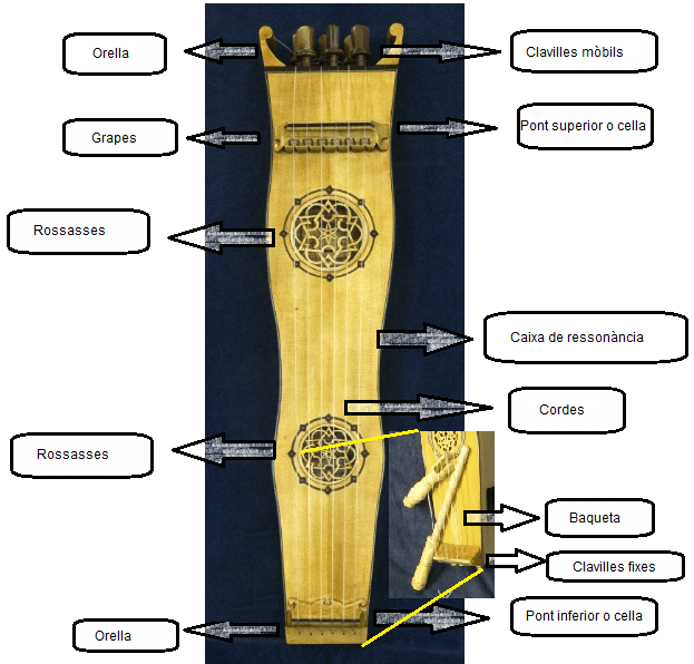 A la part inferior de l’instrument hi ha unes clavilles fixes que subjecten les cordes. A la part superior s’hi troben unes clavilles mòbils que serveixen per a subjectar la corda i al mateix temps en permeten l’afinació. Normalment, tant a la part superior com a la inferior tenen unes peces anomenades orelles, que protegeixen les clavilles. Dos ponts o celles situats sobre la tapa determinen la superfície de tensió, també anomenat «tir». En el pont superior s’hi troben unes grapes (imatge 9) que són les encarregades de produir el so sord i grinyolador. Podem trobar algun exemple on un dels ponts sigui mòbil per a poder variar l’afinació. És en aquesta zona a on la baqueta colpeja les cordes per a fer sonar l’instrument